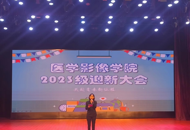 23级智能影像工程1班的新生代表申亮上台发言。他首先表达了对入学来老师们无微不至的关怀的感谢,也正是因为感受到生动活泼的校园文化氛围和严谨的专业氛围,迫切地想要融入进这个有爱的大家庭。更加明确了作为一名医员工,要把握当下,不负家长与老师们的殷切期望,勤学苦练,扎实掌握专业知识和专业技能,争做能够解决实际问题、具有行业引领潜质的健康学子,以实际行动践行“厚德至善,健行康民”的校训。