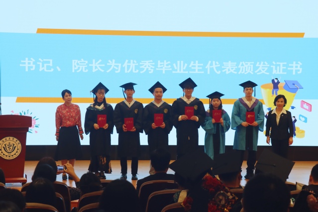 周进祝教授和李哲旭副教授共同为毕业生代表颁发毕业证书和纪念品。毕业生们从老专家、老教授手中接过的不仅仅是证书和祝福,更是无限期许,也象征着对老一辈永远谦虚、爱岗敬业、无私奉献精神的传承。