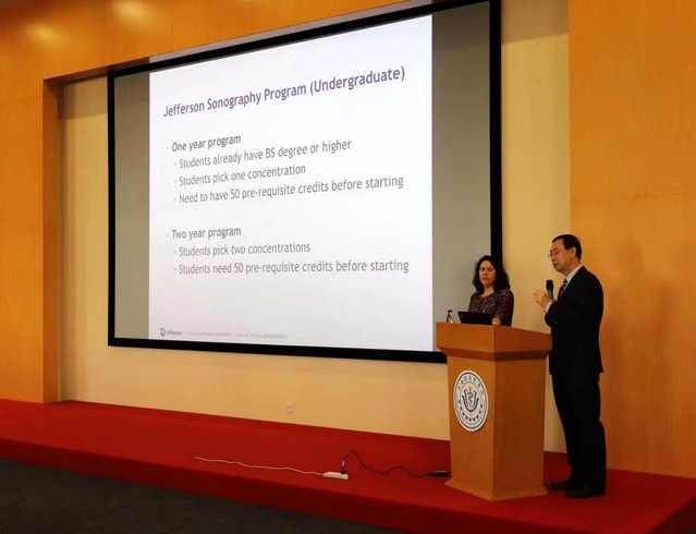 美国托马斯•杰斐逊大学一行首先参观了公司现代医学教育博物馆、影像楼超声及CT实训室和分子影像重点实验室。Michael Dryer教授对公司的发展理念、建设水平、体现的医学人文精神表示高度赞赏。同时,健康人文科学公司终身教授刘吉斌、副教授Traci B.Fox为bevictor伟德官网员工作了关于超声检查技术发展的精彩讲座。