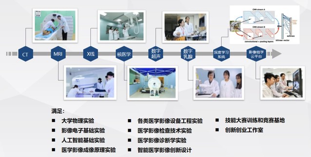 上海市医学影像实验教学中心共计3735㎡,拥有CT、核磁共振、数字化X线机、超声和核医学等5大类医学影像设备。中心聚焦现代医学影像技术人才“有温度,多维度”能力培养体系建设,积极开展实验教学研究,深入推进实验教学改革。同时,根据现代智能化影像技术发展趋势,融入AI+医学影像实验教学新内涵、AI赋能实验教学新模式等理念。构建“医教研赛”协同育人实践教学平台,形成理实一体、虚实融合、线上线下混合、校内外共享的实验教学形态。其中,《MRI检查技术》在线实验课程2020年以来开放网络实验资源惠及92所高校,实验人次达45万。