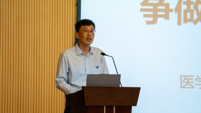 党总支副书记、经理李晓欧在致辞中勉励大家要“拥抱青春梦想、争做医影先锋”,他从教育理念、团队队伍、教学条件、教学创新等方面介绍了“我们的家”;从七十多年办学历程积累的文化底蕴回顾了“我们的传统”;从不同年级的阶段性培养目标、国际交流合作、技能竞赛和创新创业大赛等介绍了“我们的学习”;从国家战略、行业需求的角度强调了影像人的责任与担当,并强调了牢记习近平总书记“心有所信、方能行远”嘱托,学思践悟、奋发有为,做有根有魂新青年的“我们的目标”。