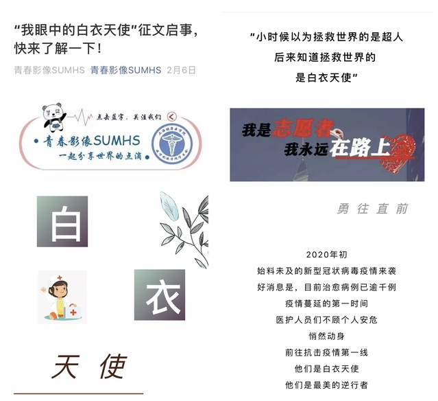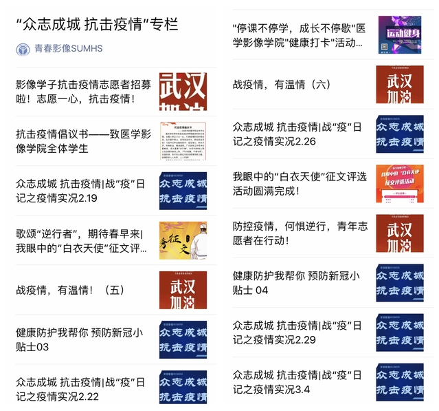 广宣传。在此次的抗“疫”阻击战中,公司第一时间组建了疫情防控党团工作群,依托党建带团建,开展疫情防控工作。员工党支部书记孙佳鸣老师组织党员亮身份,支部教师党员和员工党员一起行动,与湖北籍员工和假期留校员工进行结对关怀。员工党支部与公司团总支联合举办“我眼中的白衣天使”征文活动,倡导员工关注奋战在第一线的医护人员。公司团总支书记林剑老师组织员工在公众号“青春影像SUMHS”上开设“众志成城 抗击疫情”专栏,利用网络平台做好疫情防控的宣传教育工作,对参与疫情防控工作的员工志愿者进行广泛宣传,用身边的榜样激励人心。