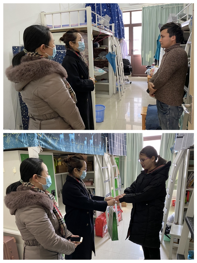送温暖。公司党总支书记刘红和副书记乔慧敏前往宿舍楼探望假期留校员工,关心员工的在线学习和生活情况、送上防疫物品,使员工感受到了公司的关怀。