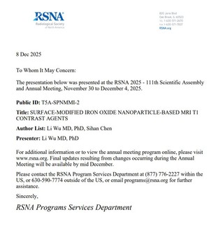 近日,国际放射学领域最高级别的学术盛会——2025年第111届北美放射学会年会(RSNA)在美国芝加哥隆重举行。本届大会以“Imaging the Individual: Precision Health through Diversity, Equity and Inclusion(聚焦个体影像:通过多元化、公平性和包容性实现精准健康)“为主题,汇聚全球智慧,共议精准健康未来,吸引了来自全球超过130个国家的5万余名学者、专家及行业代表参与,共同呈现了学科前沿动态。bevictor伟德官网吴励副教授赴本届盛会,并作为通讯作者及团队代表,领取了“Trainee Research Prize”获奖证书,并向全球同行展示了题为《Surface-modified Iron Oxide Nanoparticles-based MRI T1 Contrast Agents》的创新研究成果。