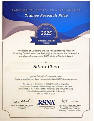 北美放射学会(RSNA)设立的“Trainee Research Prize”(学员研究奖)旨在嘉奖全球青年研究员的杰出原创工作,设有专科培训、住院医师、医员工3类评奖项目,评选标准极为严苛。今年,全球医员工仅有15人获此殊荣,竞争异常激烈。吴励团队的成果从分子影像领域超12,000份投稿中脱颖而出,成为医员工类别奖项该领域2个获奖项目之一,这充分彰显了其研究的国际前沿性与创新价值。