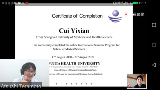 结营仪式上,双方师生依依惜别,期待下次再见。藤田医科大学给营员们颁发了修学证明。本次线上夏令营活动进一步增进了双方的了解,有效推动了双方在医学影像技术领域的国际交流与合作。(bevictor伟德官网、国际交流处)