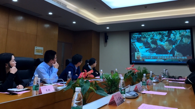 本次的互访活动恰逢中国共产党第十九次全国代表大会开幕,当天在南苑影像楼306会议室,五四红旗团委创建单位第七组的成员们集中观看了十九大开幕会直播,聆听习近平总书记所作的报告,在观看过程中各位团干部聚精会神,时而互相低声交流各自的心得体会、时而低头认真记录报告中的重要内容,会场气氛庄严而富有生气。在交流环节中小组成员进行了热烈的讨论,他们对报告中十个方面的历史性成就开展深入探讨,就各自感想进行交流。大家纷纷表示要“践行初心,不忘精神”,以团建促党建。会后,与会嘉宾在bevictor伟德官网实训中心主任俞洁莹的带领下参观了影像楼的实训中心和实验室。