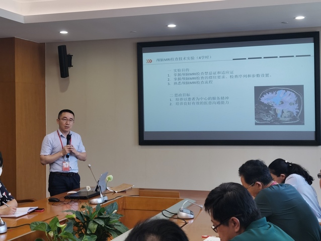 首先,由医学影像技术教研室主任彭文献老师开展《颅脑MRI检查技术实验》的公开课及说课,这堂课程要求员工能够做到三会:会做、会说、会评,并从课程思政角度,培养员工以患者为中心的服务精神,培养员工良好有效的医患沟通能力。本节实验课程采用虚实结合、线上线下相结合的教学设计,通过实体磁共振设备实验锻炼员工对患者接待等服务意识,通过线上磁共振成像云实验室锻炼员工MRI检查技术相关知识,整个实验设计包含了一次MRI检查的全过程。通过说课,彭老师向老师们讲述了如何将课程思政元素设计到本次实验教学的各个环节中去,并通过对线上教学平台的资源建设提高员工的学习兴趣。徐经理指出,希望在今后的课程建设中,彭老师能够带领课程教学团队成员,将教学实践经验记录下来,将课程思政的教学设计记录在各类教学文件中,更好地进行课程教学总结,提炼MRI检查技术实验课程的课程思政特色。