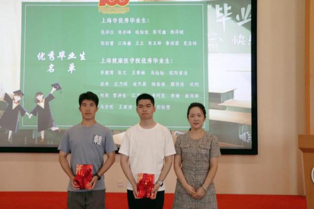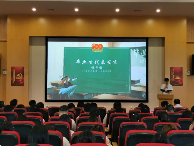教师代表周进祝教授回忆了与同学们相处的点滴,回忆了21届毕业生取得的优异成绩,并且分享了自己一生立志教育事业、感恩国家培养、回报公司信任的奋斗历程,叮嘱同学们要:牢记习近平总书记“爱国、励志、求真、力行”的教导;学会感恩、超越感恩,做一个高尚的人;学会学习,提升技能技术,担负起生命和健康的责任;懂得包容,认认真真做事、坦坦荡荡做人;立志求恒,脚踏实地、志存高远、追求梦想、永不懈怠。上海市第一人民医院放疗科技师、2019届员工杨帅,回顾自己从校园到工作岗位的经历,分享了三点体会与学弟学妹共勉:不忘学医初心、坚持医学梦想;坚持继续教育、不忘终身学习;坚持脚踏实地、做人要实、谋事要实。