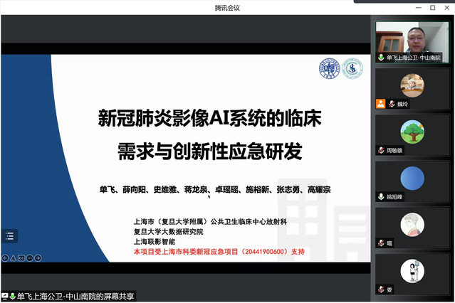 单教授以《新冠肺炎影像AI系统的临床需求与创新性应急研发》为题,介绍了AI技术在新冠肺炎的诊断、评估疗效以及疾病预后的预测等方面的研究成果;还介绍了基于深度学习的COVID-19患者肺部CT影像的分割等系列研究与成果;并分享了科研团队联合公关的经验。影像团队与复旦大学大数据公司以及联影,合作开发的CT-AI软件实现了对COVID-19筛查与量化分析,在新冠疫情诊疗中发挥了巨大作用,且成果丰硕,很好实现了技术成果转化。会上,公司教师分别从新冠肺炎的诊断与临床评估、肺部CT影像的分割算法、肺部MRI成像新技术等方面跟单主任进行了热烈讨论与交流。