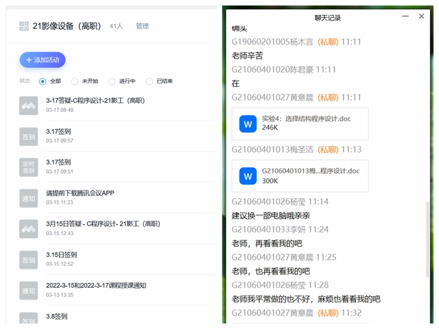 肖寒老师本学期给21级智能医疗装备技术(医学影像设备方向高职)班进行“C程序设计”课程的授课。开学初已经进行3周的线下授课,员工对课程已经入门,突然转为线上授课,担心一年级的员工不适应,肖老师在课前给员工发出通知,仔细交代在线学习的方式,给出了第一次课程学习的任务,明确了学习进度检查的方法,让同学清楚明白的进行学习。