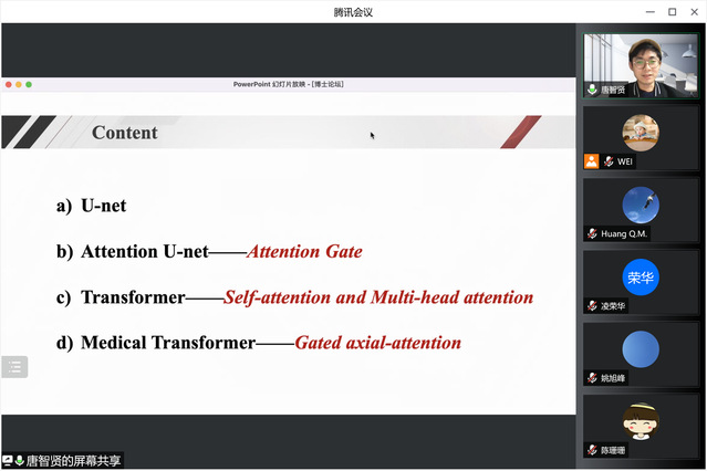 唐智贤博士以《Attention U-net及其改进在医学图像分割中的应用》为题,围绕“Attention gate”、“self-attention & multi-head attention”、“axial-attention”三个注意力机制的概念展开论述,对上述不同机制进行分析,找出问题并提出解决方法,并将这些机制应用在病理图像细胞核分割、前列腺MRI图像分割和心脏超声图像分割中,取得了良好的实验结果。在交流互动环节中,公司多位教师针对attention U-net的临床应用以及科研中遇到的图像处理的问题与唐老师进行交流,针对参会师生所提出的疑难问题,唐老师也一一进行详解,现场科研气氛活跃而热烈。