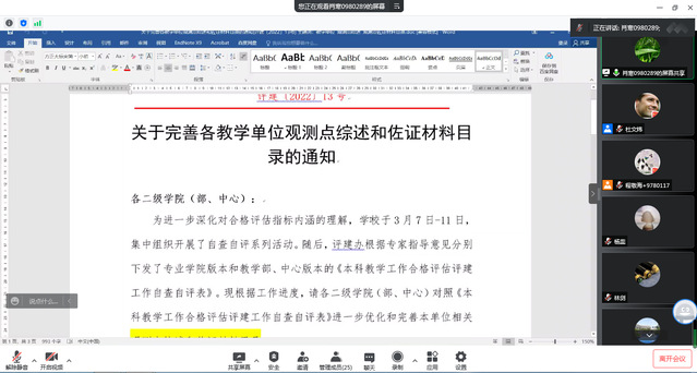 会议首先由教学副经理(挂职)肖寒对观测点综述的撰写以及佐证材料目录的完善等工作任务进行布置和解读。肖寒从撰写内容的角度、综述篇幅的控制、段落格式的划分等方面向与会人员布置了撰写观测点综述的要求,并根据专家指导意见详细解读了观测点目录的编码原则和共性问题。随后评建工作组成员就两个方面的内容开展了交流互动,达成了初步共识。后续各观测点工作小组将根据此次会议的要求开始撰写综述并对目录进行完善。